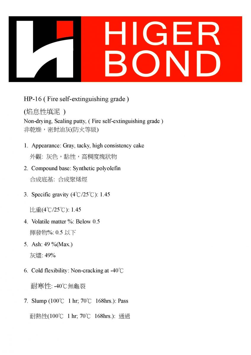 HP-16 ( Fire self-extinguishing grade ) (焰息性填泥 ) Non-drying, Sealing putty, ( Fire self-extinguishing grade ) 非乾燥,密封油灰(防火等級) 1. Appearance: Gray, tacky, high consistency cake 外觀: 灰色,黏性,高稠度塊狀物 2. Compound base: Synthetic polyolefin 合成底基: 合成聚烯烴